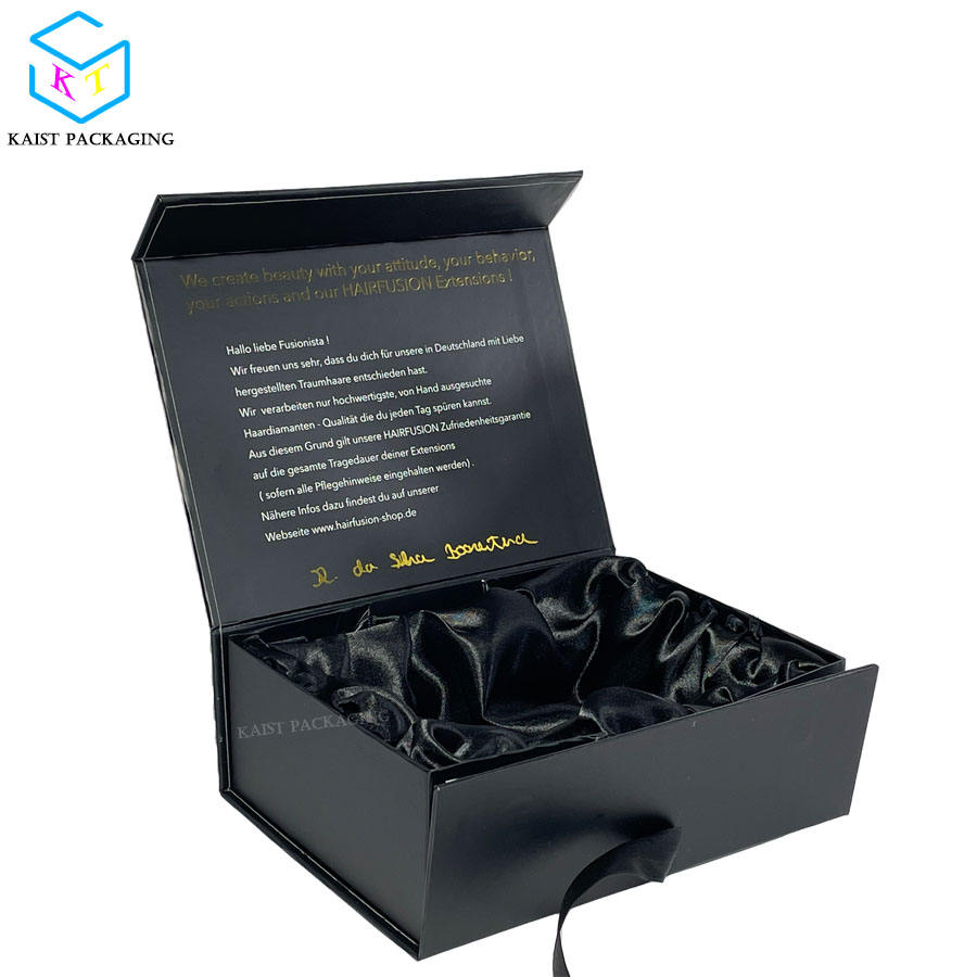 black collapsible magnetic satin lined hair boxes weave packaging custom logo